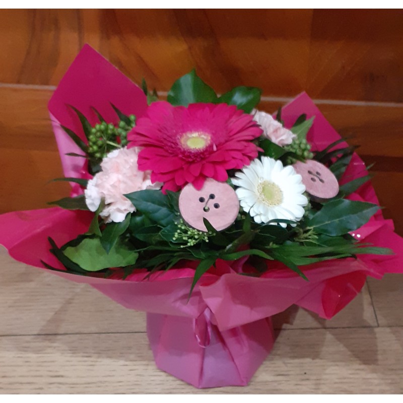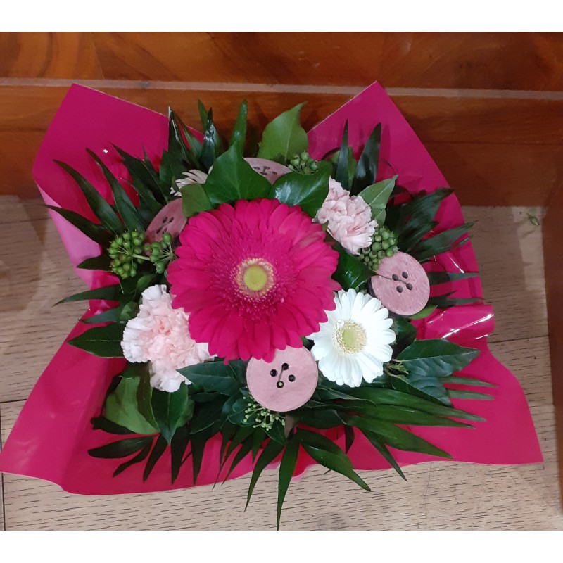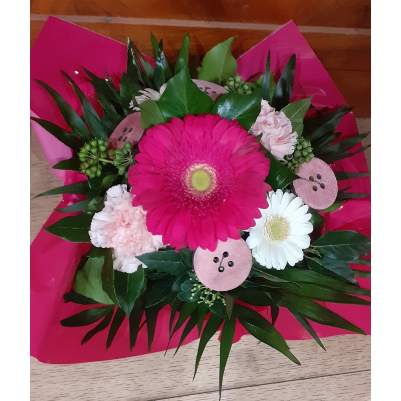 Bouquet rond présenté en bulle d'eau dans des couleurs de rose et de blanc principalement. Avec un mélange de fleurs en fonction de la disponibilité en magasin (rose, œillet, gerbera, germini, alstroemère, lys, choux, margot…) et des éléments décoratifs ( qui peuvent variés en fonction des saisons).
