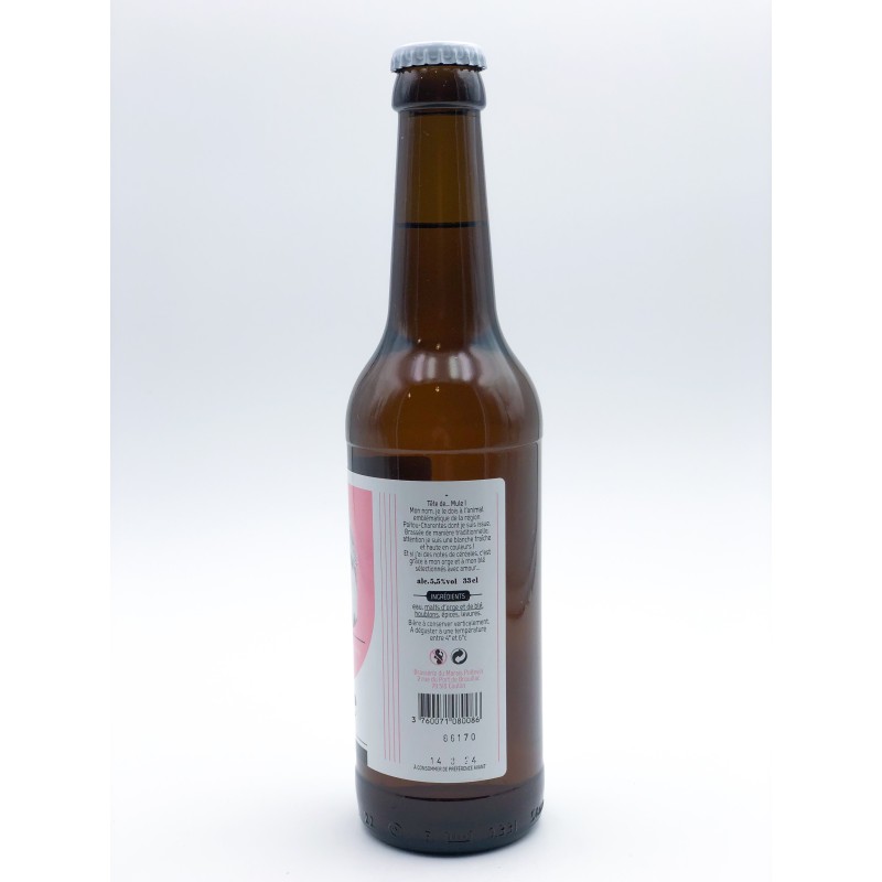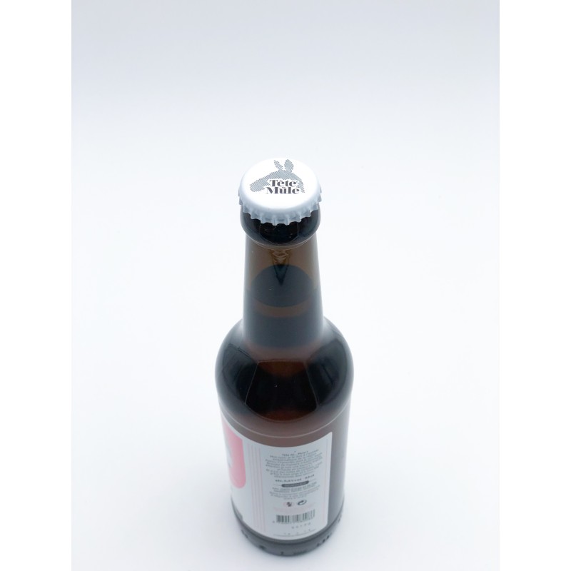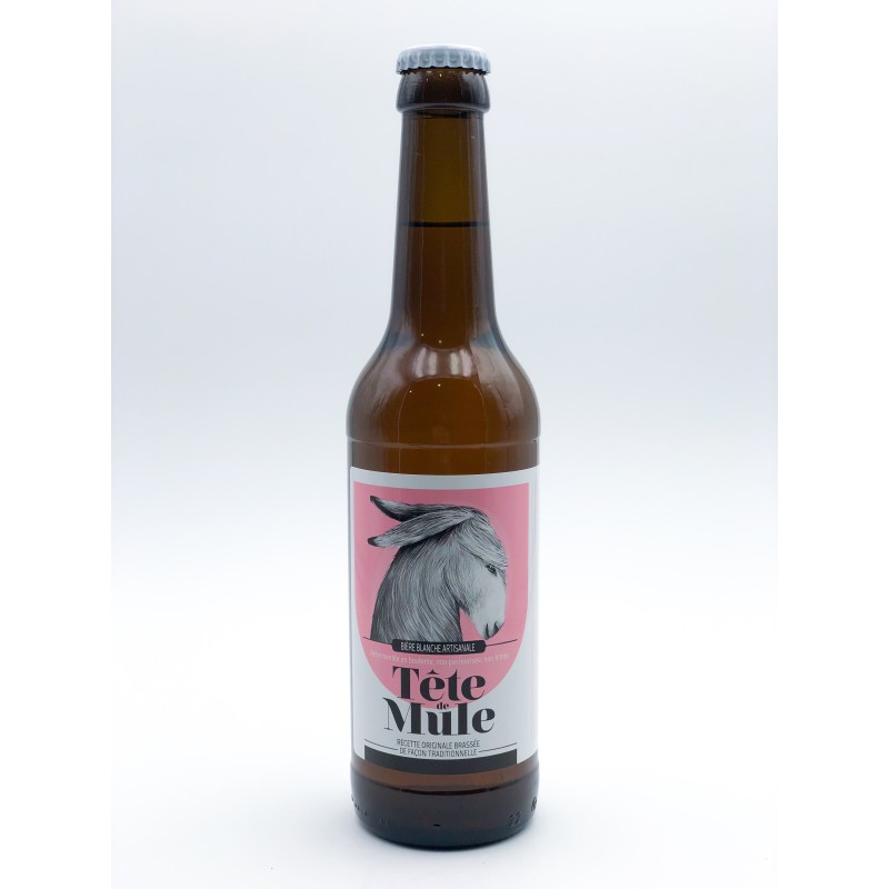 Bouteille de bière de Tête de Mule Blanche en 33 cl. Produit local fabriqué dans une commune voisine du magasin. Brasserie artisanale. Une blanche fraîche et haute en couleur, des notes de céréales.