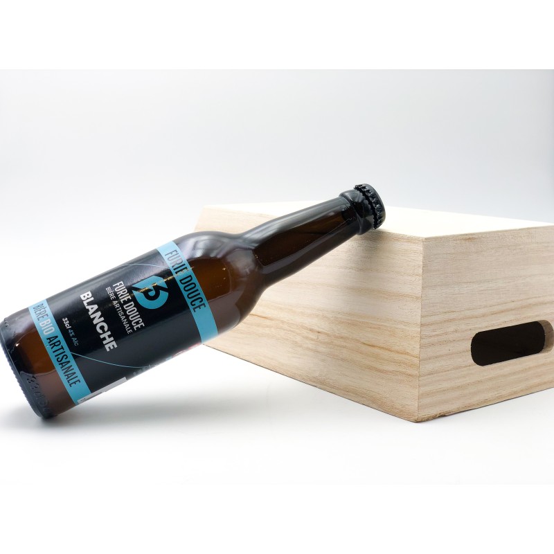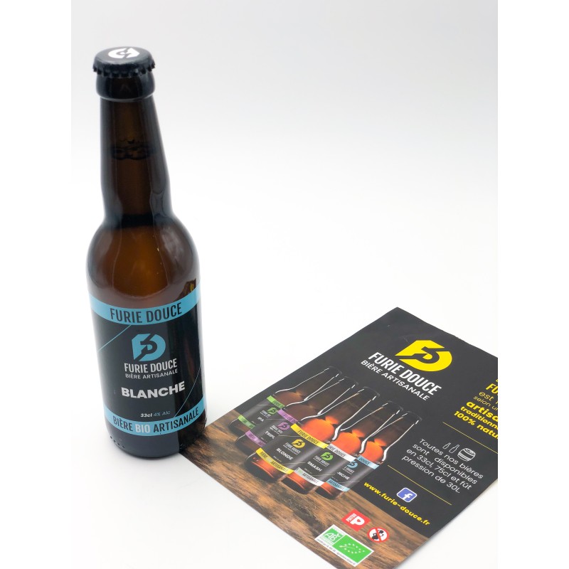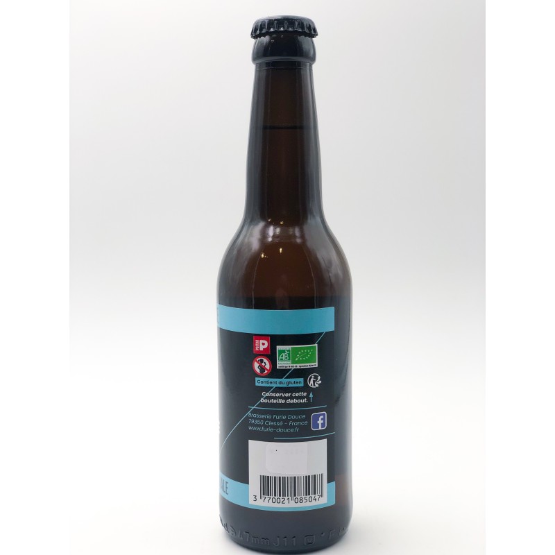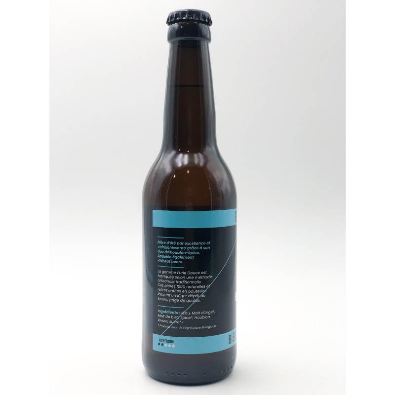 Bouteille de bière Furie Douce Blanche de 33 cl. 4 %. Produit fabriqué en local dans les Deux-Sèvres. Bière artisanale, 100 % naturelle et refermentée en bouteille laisse un léger dépôt de levure, gage de qualité. Bière d'été par excellence et rafraîchissante grâce à son duo de houblon-épice. Appelée également "Wheat beer".