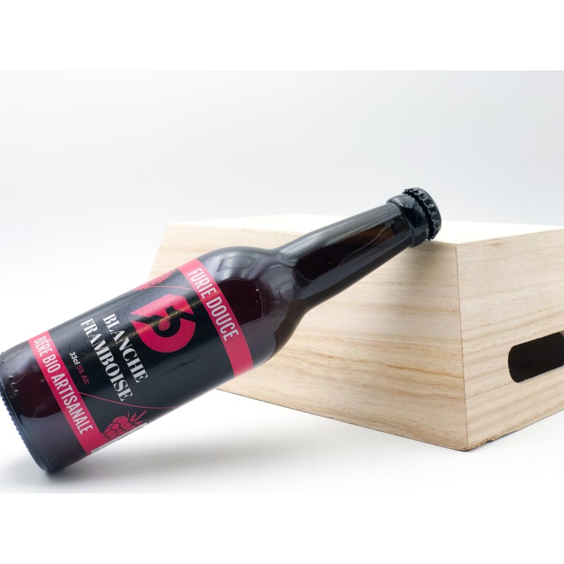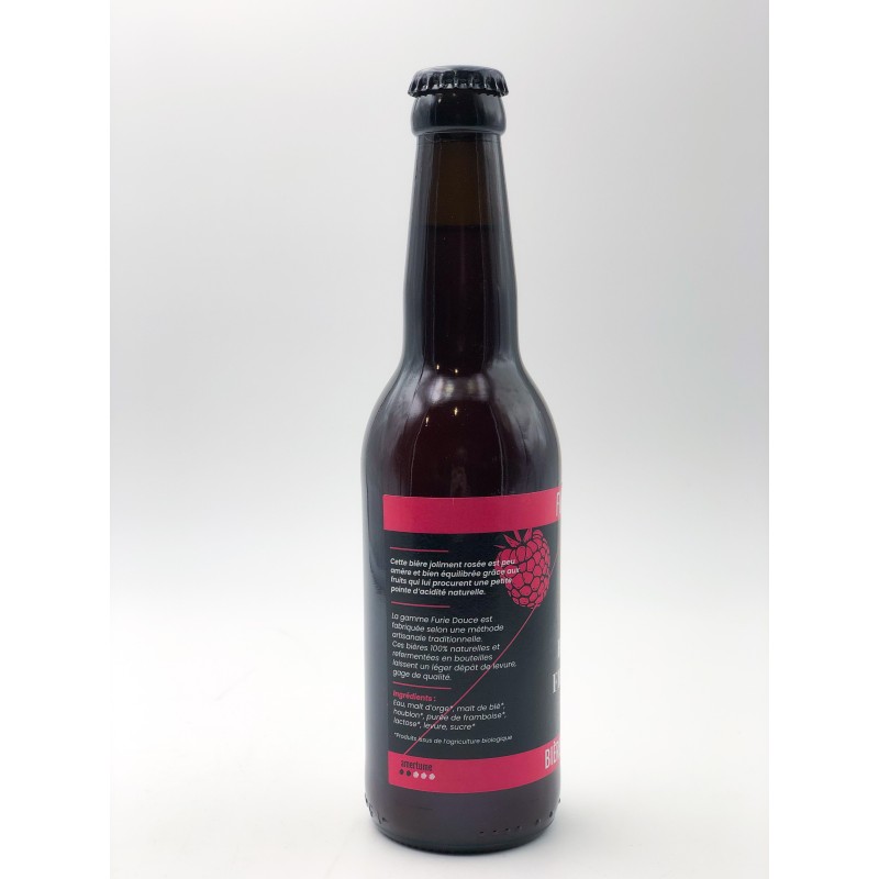 Bouteille de bière Furie Douce Blanche Framboise de 33 cl. 5 %. Produit fabriqué en local dans les Deux-Sèvres. Bière artisanale, 100 % naturelle et refermentée en bouteille laisse un léger dépôt de levure, gage de qualité. Cette bière joliment rosée est peu amère et bien équilibrée grâce aux fruits qui lui procurent une petite pointe d'acidité naturelle.
