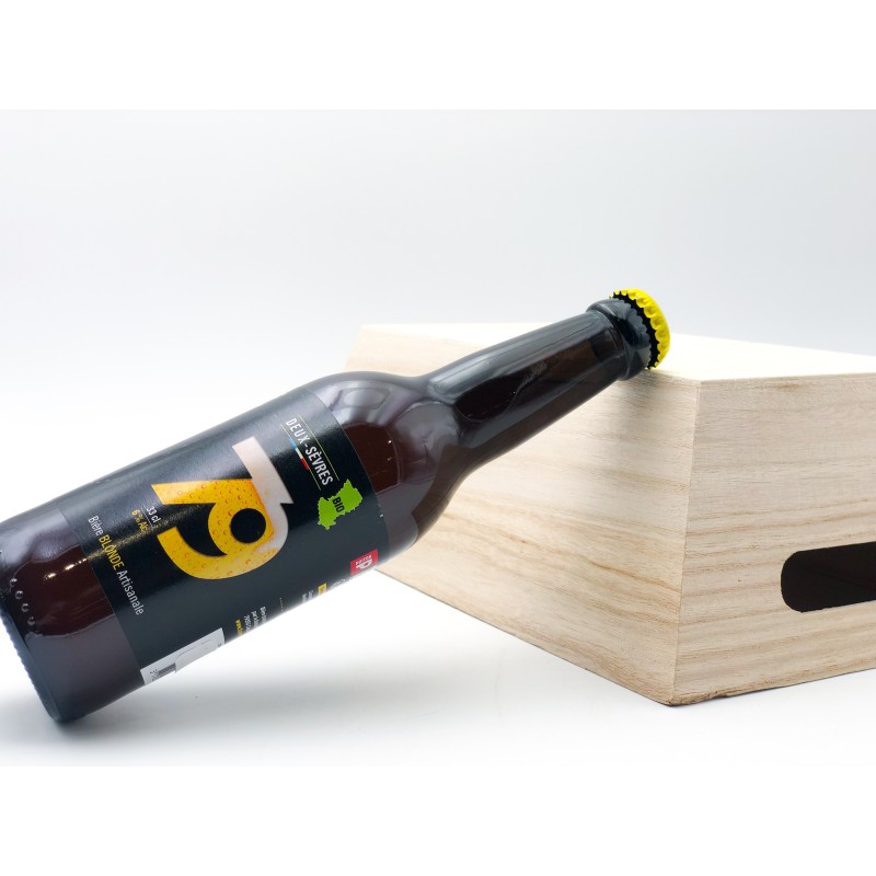 Bouteille de bière Furie Douce 79 de 33 cl. 6 %. Produit fabriqué en local dans les Deux-Sèvres. Bière artisanale, 100 % naturelle et refermentée en bouteille laisse un léger dépôt de levure, gage de qualité. Cette bière en référence au département des Deux-Sèvres, bière blonde aux arômes fruités, épicés avec une petite pointe houblonnée.
