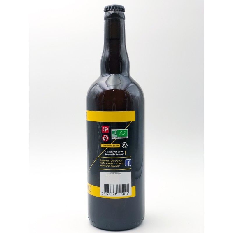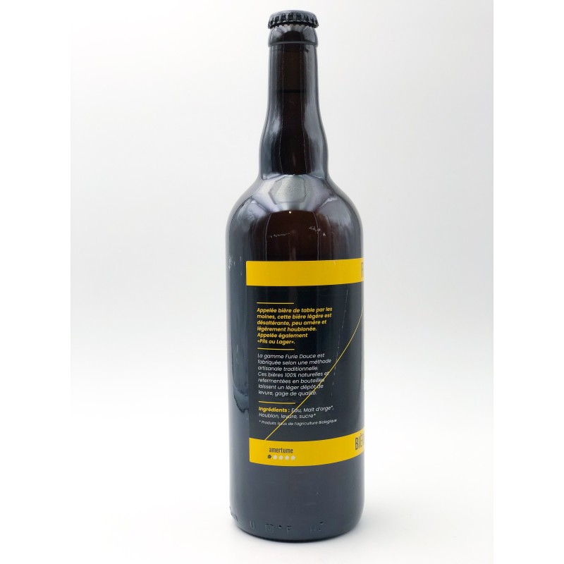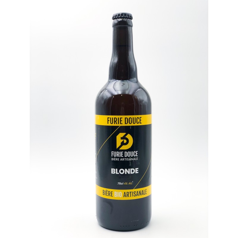 Bouteille de bière Furie Douce Blonde de 75 cl. 4 %. Produit fabriqué en local dans les Deux-Sèvres. Bière artisanale, 100 % naturelle et refermentée en bouteille laisse un léger dépôt de levure, gage de qualité. Appelée bière de table par les moines, cette bière légère est désaltérante, peu amère et légèrement houblonnée. Appelée également "Pils ou Lager".