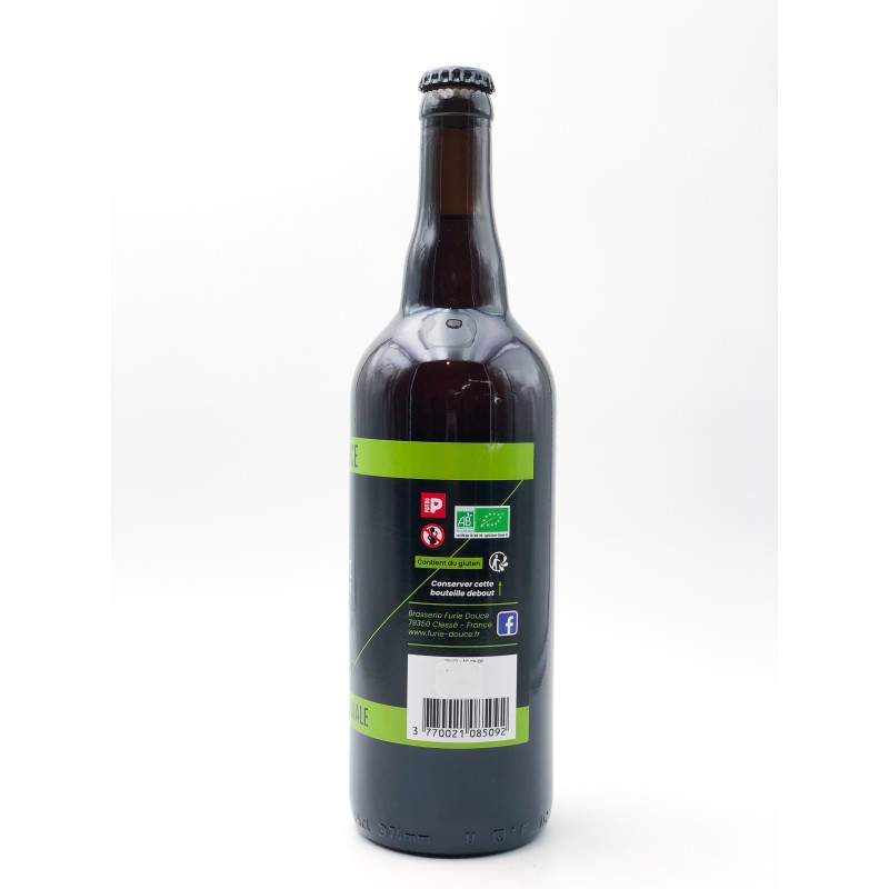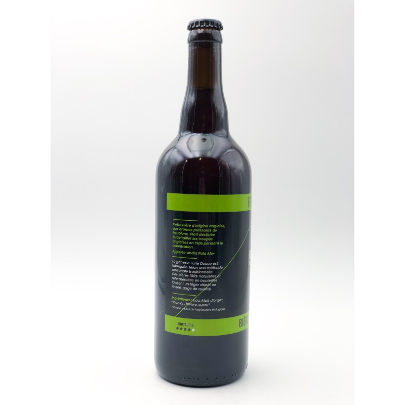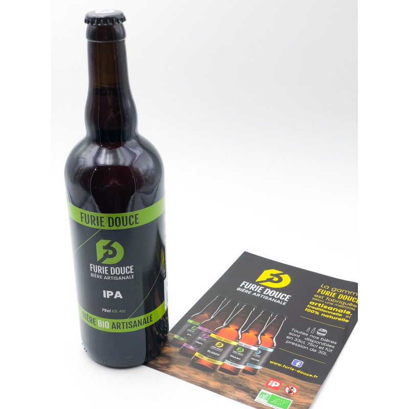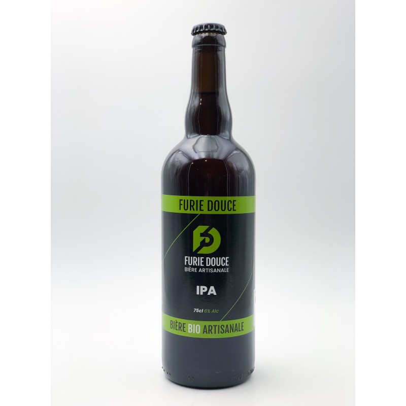 Bouteille de bière Furie Douce IPA de 75 cl. 6 %. Produit fabriqué en local dans les Deux-Sèvres. Bière artisanale, 100% naturelle et refermentée en bouteille laisse un léger dépôt de levure, gage de qualité. Cette bière d'origine anglaise, aux arômes puissants de houblons, était destinée à ravitailler les troupes anglaises en Inde pendant la colonisation. Appelée "India Pale Ale".