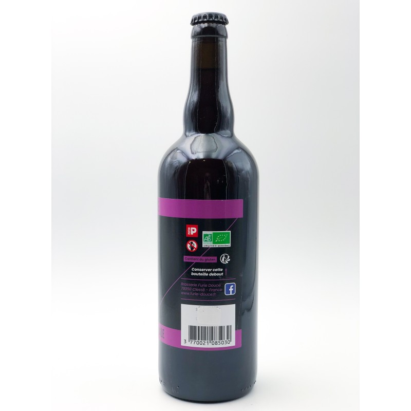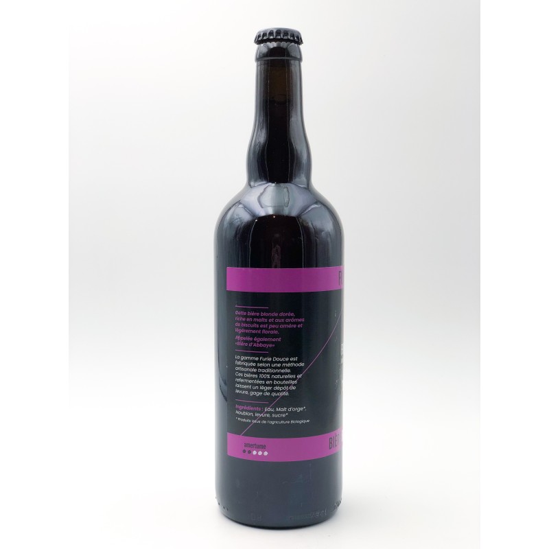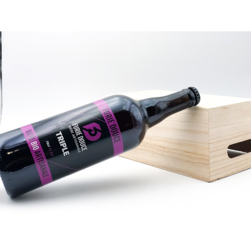 Bouteille de bière Furie Douce Triple de 75 cl. 7 %. Produit fabriqué en local dans les Deux-Sèvres. Bière artisanale, 100 % naturelle et refermentée en bouteille laisse un léger dépôt de levure, gage de qualité. Cette bière blonde dorée, riche en malts et aux arômes de biscuits est peu amère et légèrement florale. Appelée également "Bière d'Abbaye".