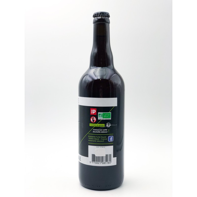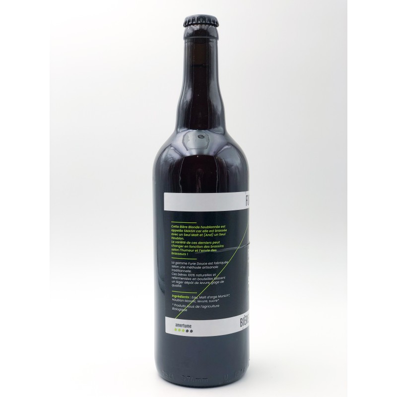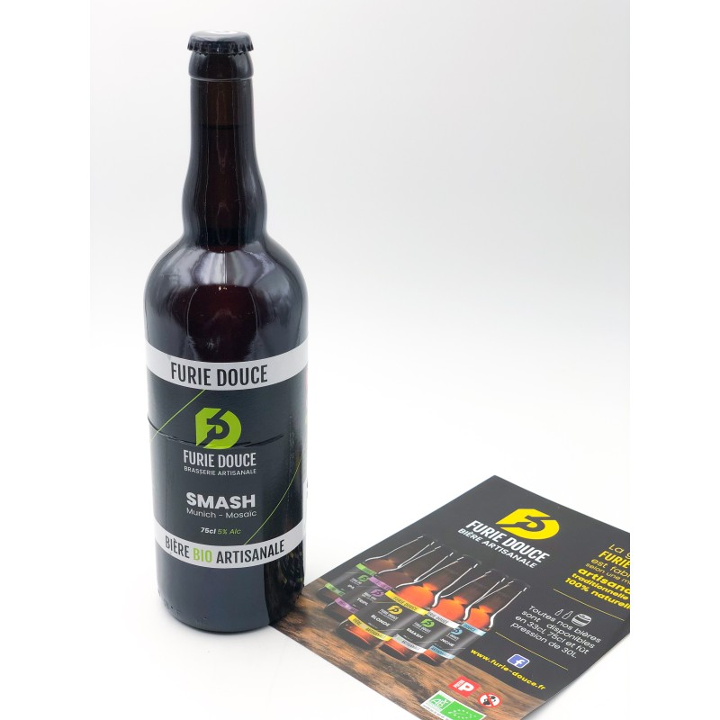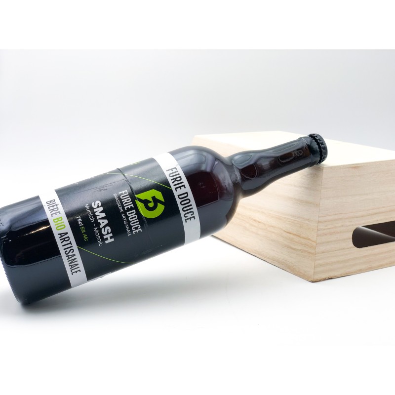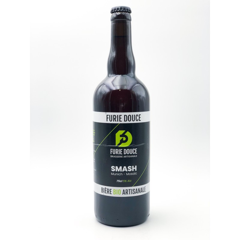 Bouteille de bière Furie Douce SMASH de 75 cl. 5 %. Produit fabriqué en local dans les Deux-Sèvres. Bière artisanale, 100 % naturelle et refermentée en bouteille laisse un léger dépôt de levure, gage de qualité. Cette bière blonde houblonnée est appelée SMASH car elle est brassée avec un Seul Malt et (And) un Seul Houblon. La variété de ces derniers peut changer en fonction des brassins selon l'humeur et l'envie des brasseurs !