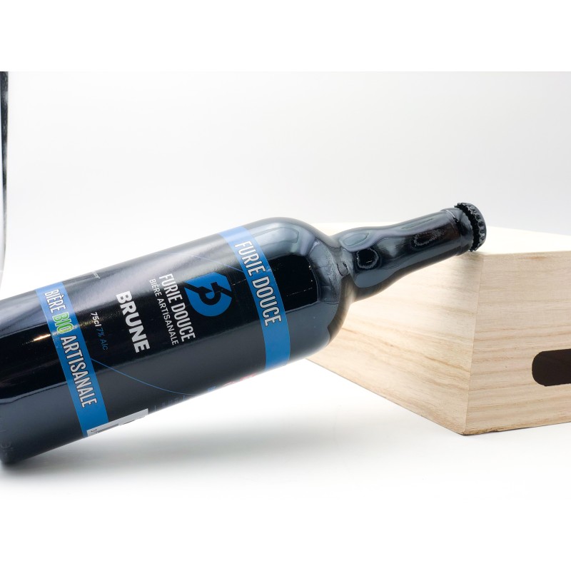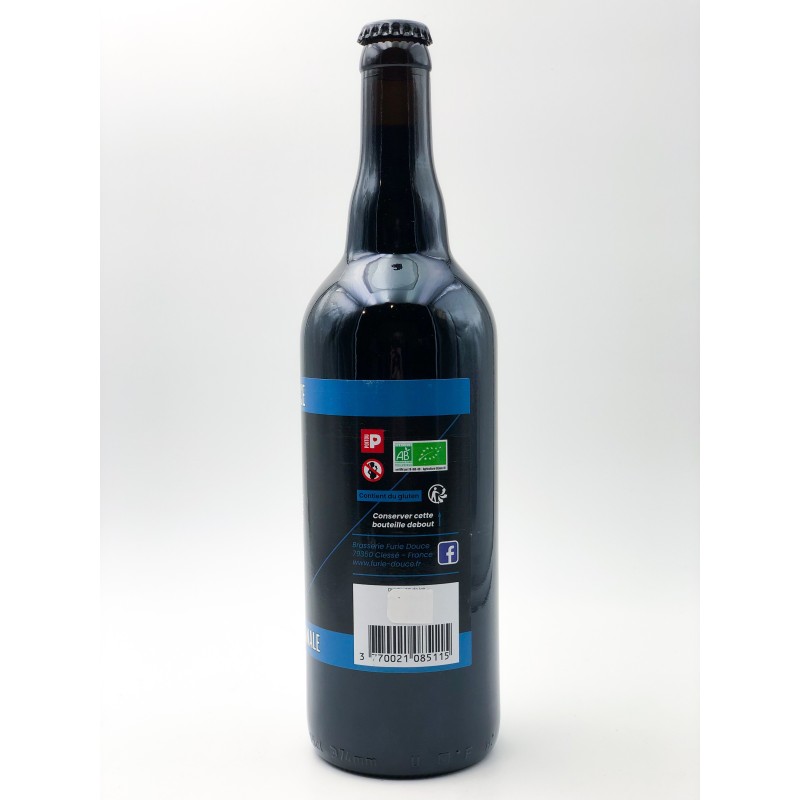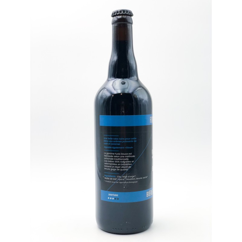 Bouteille de bière Furie Douce Brune de 75 cl. 7 %. Produit fabriqué en local dans les Deux-Sèvres. Bière artisanale, 100 % naturelle et refermentée en bouteille laisse un léger dépôt de levure, gage de qualité. Une belle robe noire pour cette bière aux arômes puissants de café et caramel, appelée également "Stout".