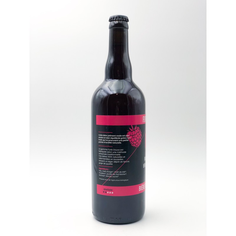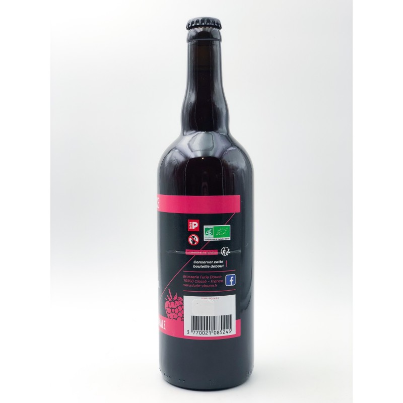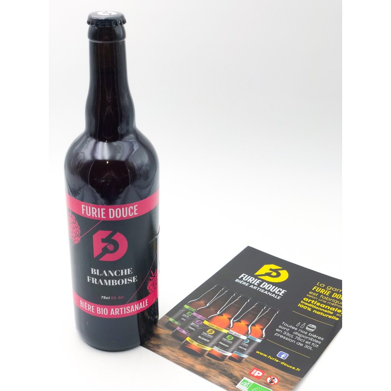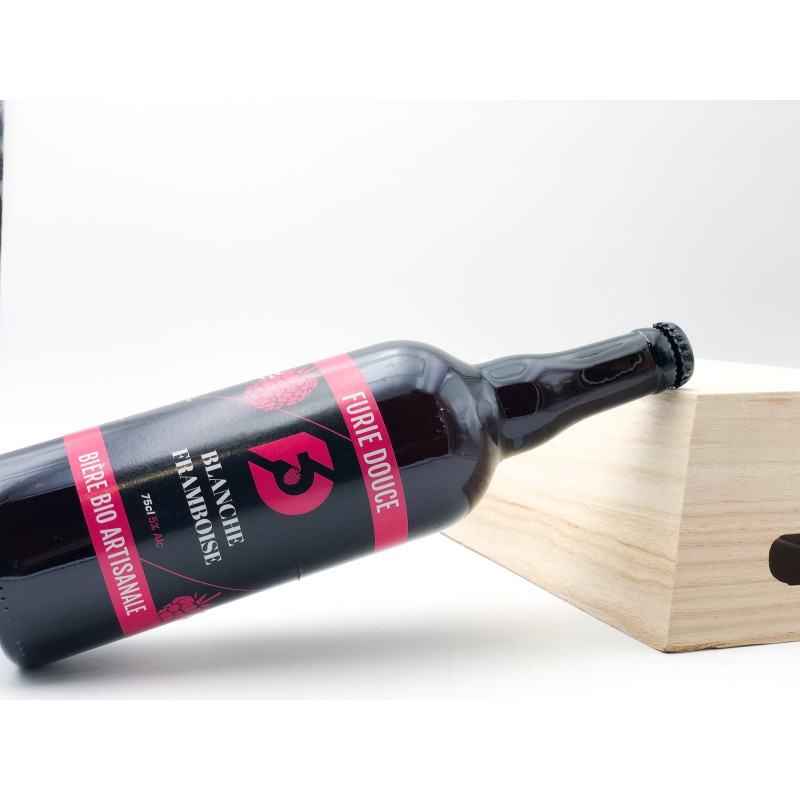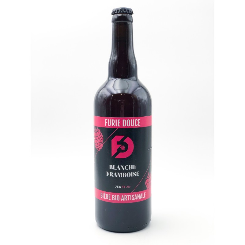 Bouteille de bière Furie Douce Blanche Framboise de 75cl. 5 %. Produit fabriqué en local dans les Deux-Sèvres. Bière artisanale, 100 % naturelle et refermentée en bouteille laisse un léger dépôt de levure, gage de qualité. Cette bière joliment rosée est peu amère et bien équilibrée grâce aux fruits qui lui procurent une petite pointe d'acidité naturelle.