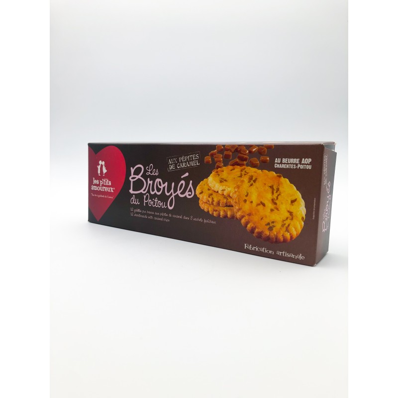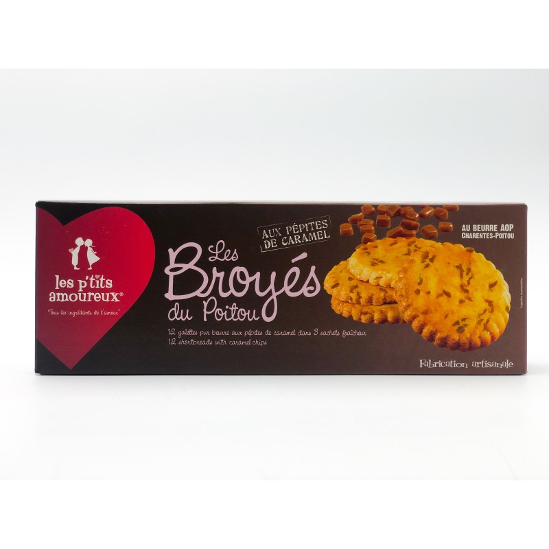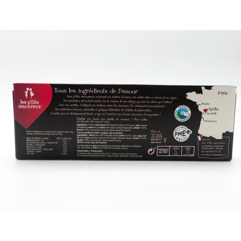 Boîte de 12 galettes pur beurre aux pépites de caramel dans 3 sachets fraîcheur au beurre AOP Charentes-Poitou. Produit local fabriqué dans une commune voisine du magasin. Avec sel marin de l'île de Ré, arôme naturel de caramel.