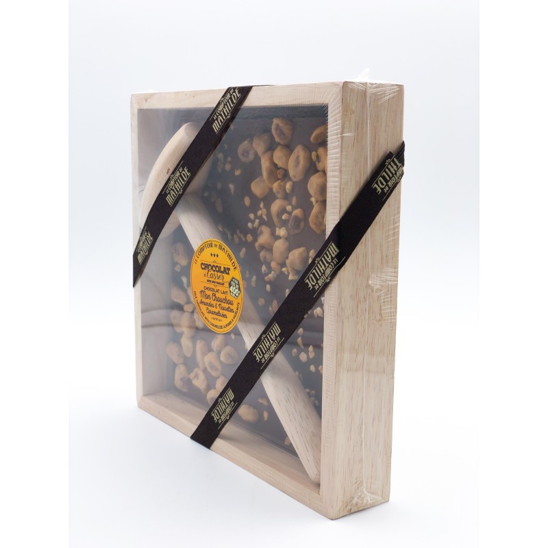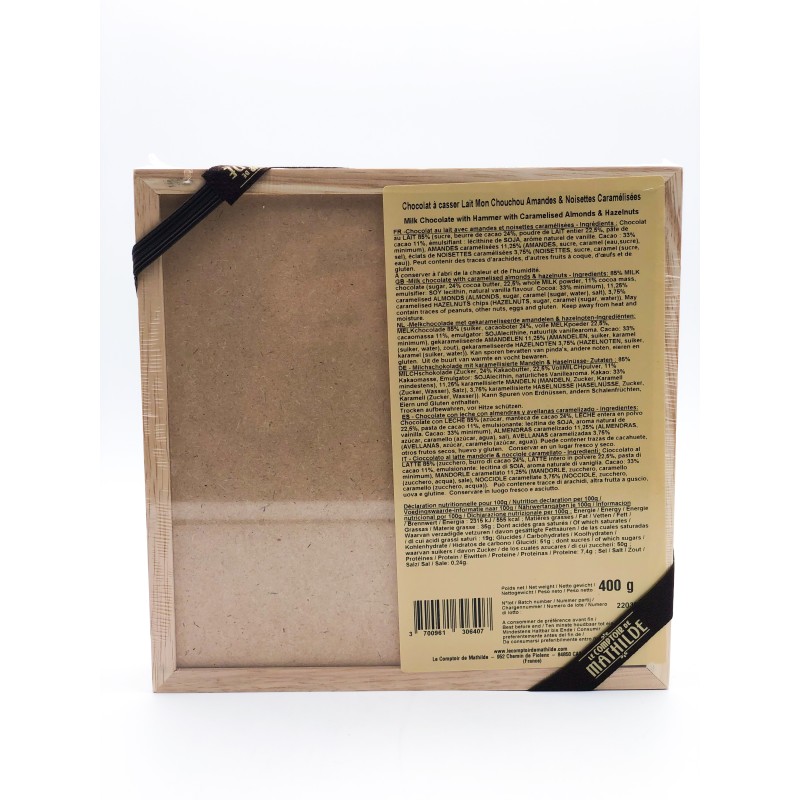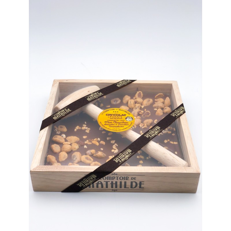 Plaque de chocolat au lait à casser mon chouchou amandes et noisettes caramélisées de 400g. Un retour immédiat en enfance, lors de fêtes foraines, où la gourmandise règne et les chouchous caramélisés aussi ! Pour ceux qui raffolent de ces sucreries, votre bonheur se trouve dans cette plaque de chocolat à casser !