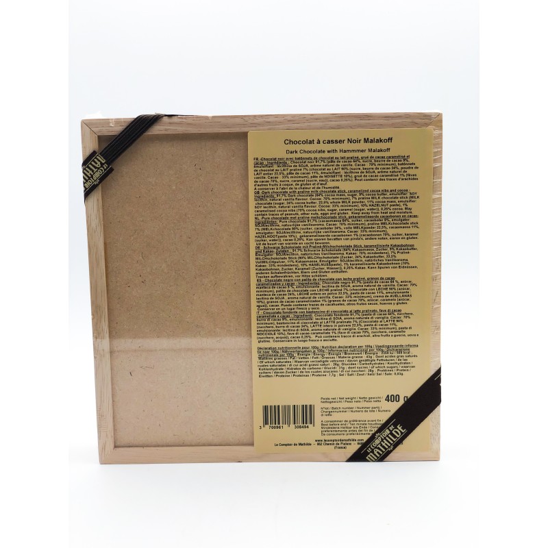 Plaque de chocolat noir à casser Malakoff de 400g. Les amateurs de Malakoff retrouveront les saveurs et les plaisirs authentiques de leur friandise d’enfance. La juste dose pour sentir le croquant et le juste parfum pour déguster avec gourmandise son chocolat.