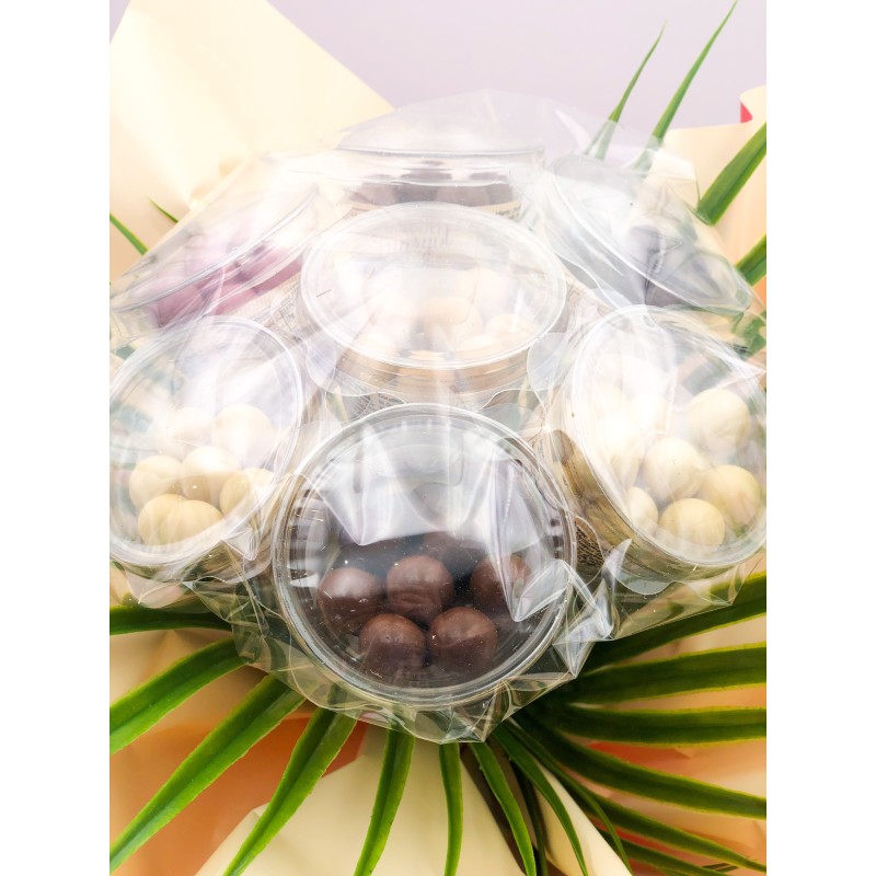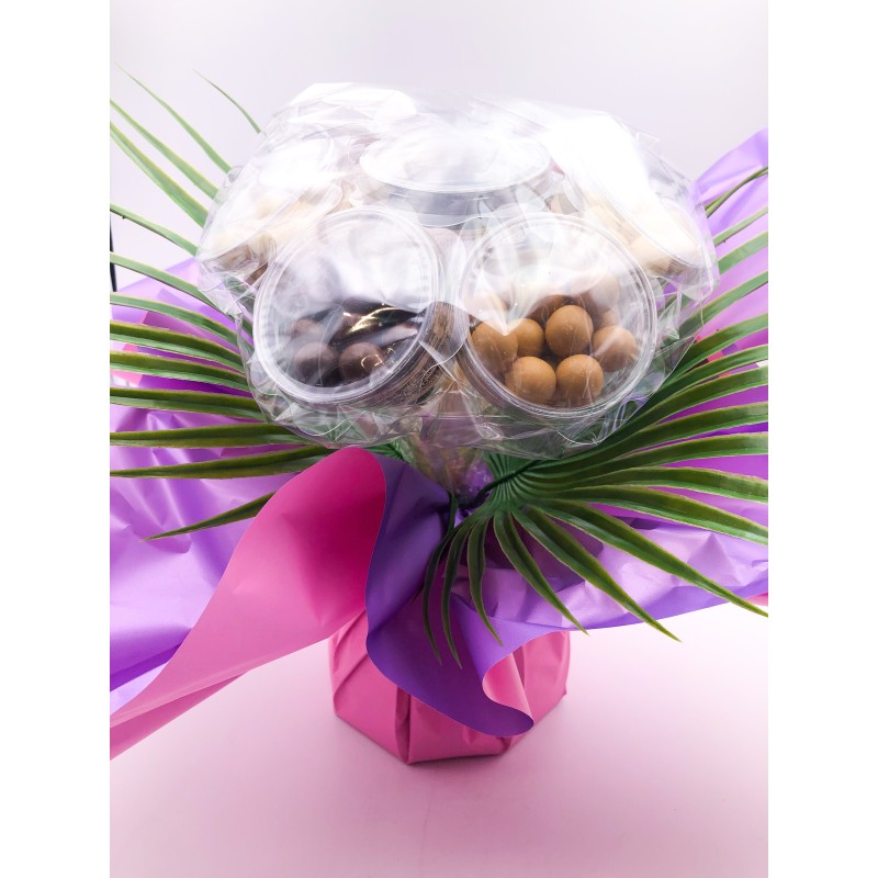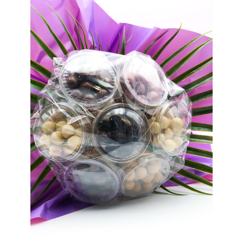 Bouquets de 7 pots de croustillettes au chocolat de différents parfums, pot de 30g chacun. Chocolat noir, vanille, fraise, caramel, chocolat au lait.