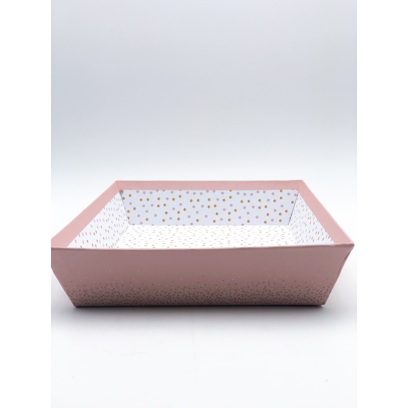Corbeille en carton "ces petites gourmandises qui rendent la vie si belle", dans les tonds rosé, avec intérieur blanc à poids rose et marron.