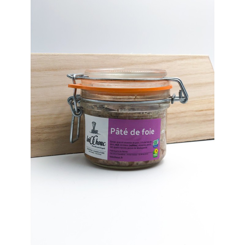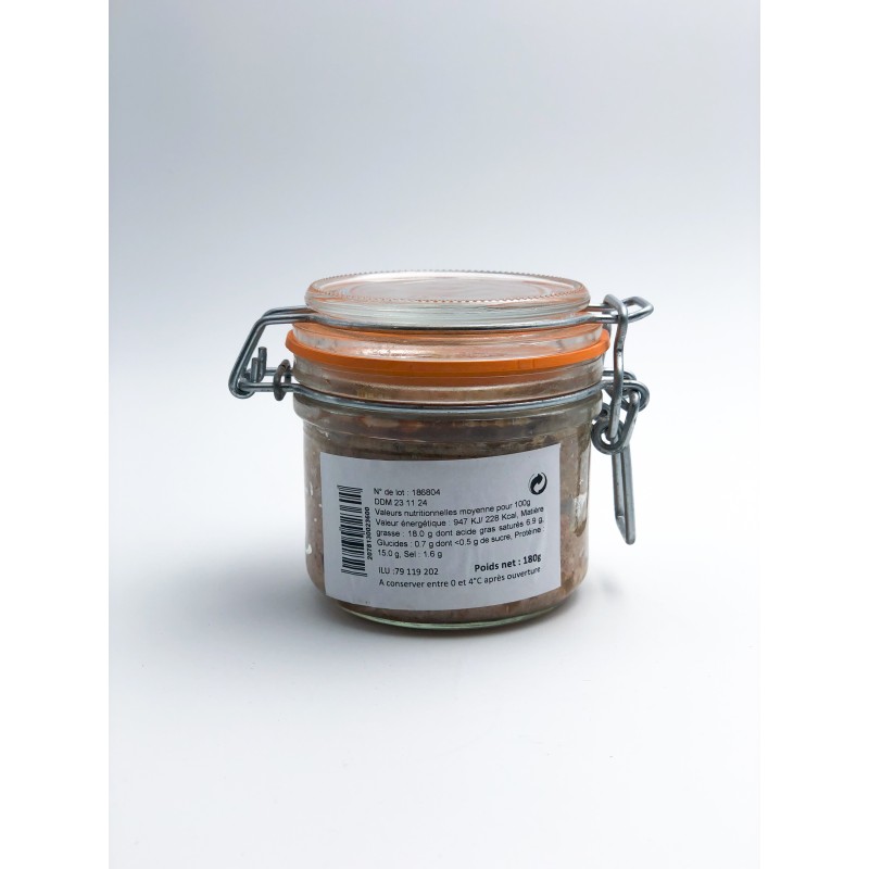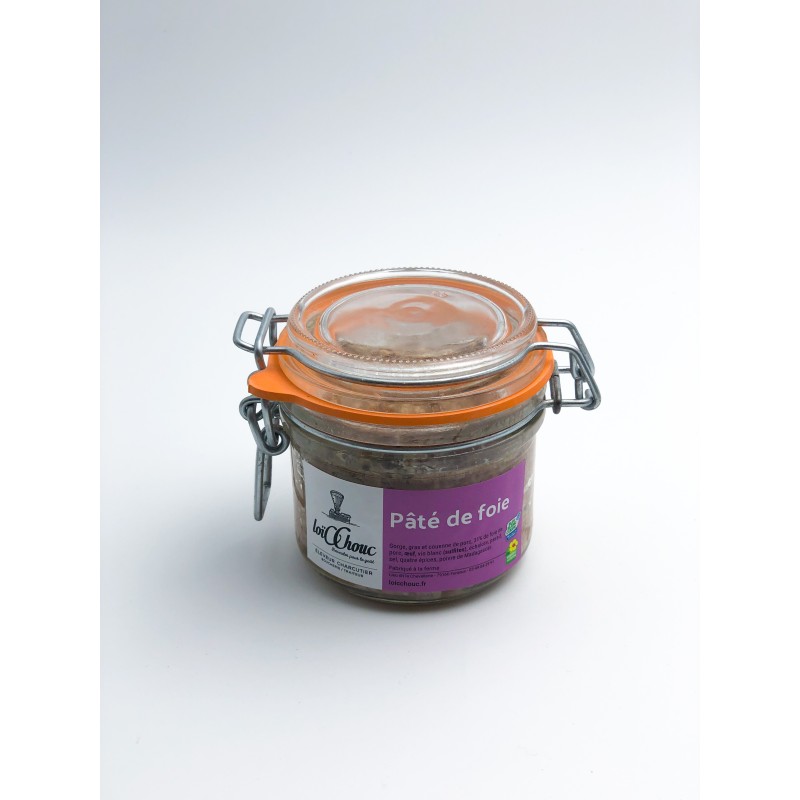 Bocal de Pâté de foie de 180g. Produit local fabriqué dans une commune voisine du magasin par un éleveur, charcutier.