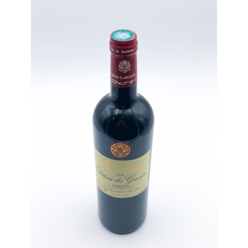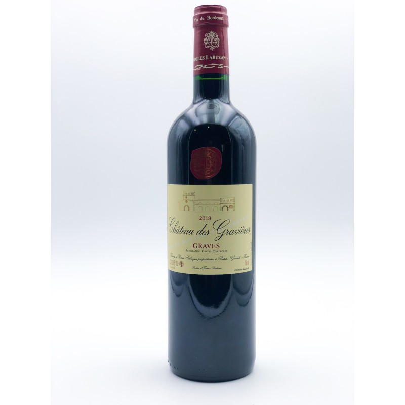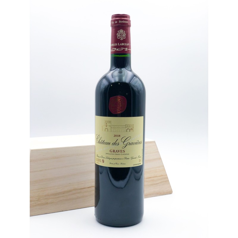 Bouteille de vin de Bordeaux Château des Gravières Graves de 75 cl. Année 2018. 13,5 %. Vin rouge très fruité, notes de fruits rouges et boisés. Une douceur par ses tannins enrobés de vanille et de réglisse. Une merveilleuse harmonie. Un ensemble gourmand aux atouts élégants. Contient des sulfites. L'abus d'alcool est dangereux pour la santé, à consommer avec modération.