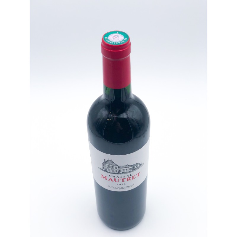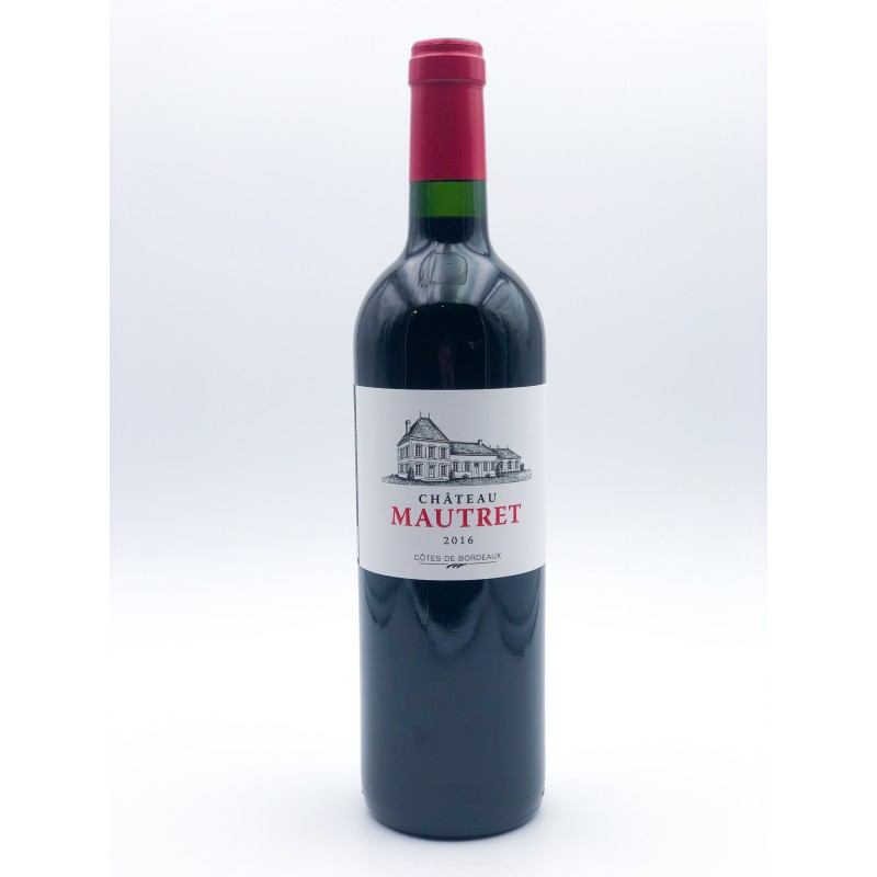 Bouteille de vin Côte de Bordeaux Château Mautret de 75 cl. Année 2016. 13 %. Vin rouge avec beaucoup de fruit. Développe des arômes de fruits rouges et de sous-bois. Idéal avec agneau, viandes rouges, fromages. Contient des sulfites. L'abus d'alcool est dangereux pour la santé, à consommer avec modération.