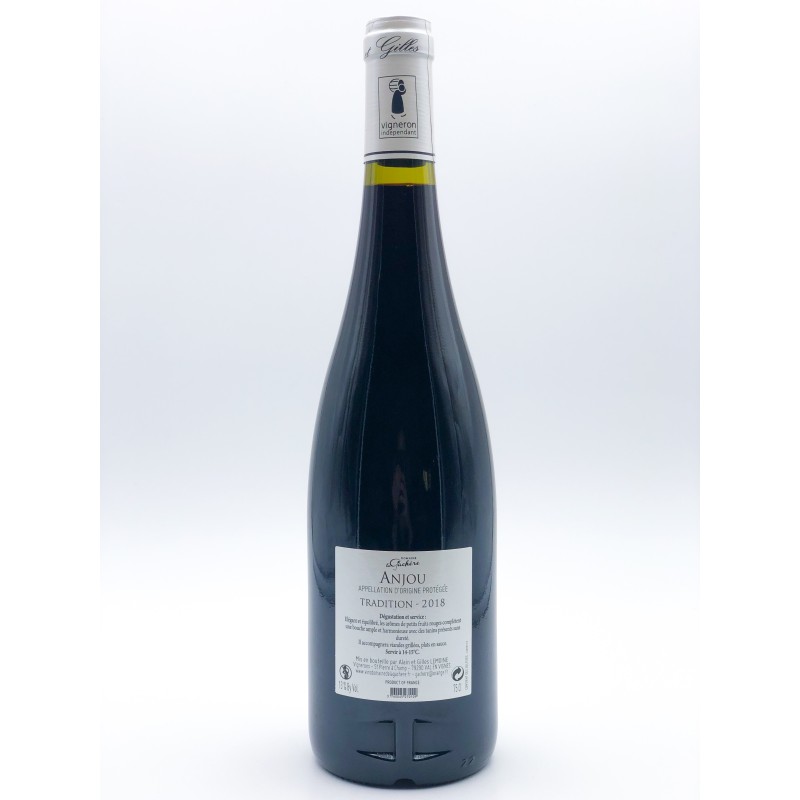 Bouteille de vin d'Anjou Tradition de 75 cl. Année 2018. 13 %. Un vin rouge élégant et équilibré, les arômes de petits fruits rouges complètent une bouche ample et harmonieuse aves des tanins présents sans dureté. Il accompagnera viandes grillées, plats en sauce. Mis en bouteille par les frères Lemoine (Alain et Gilles). Contient des sulfites. L'abus d'alcool est dangereux pour la santé, à consommer avec modération.