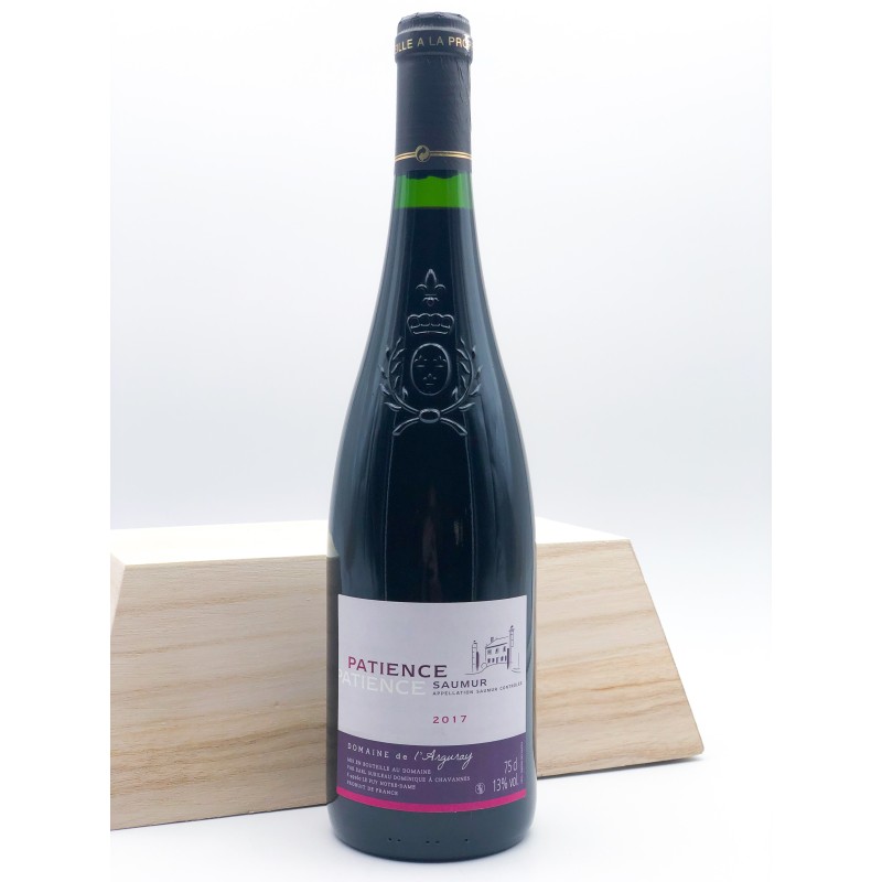 Bouteille de vin de Saumur Patience du Domaine de L'Arguray de 75 cl. Année 2017. 13 %. Vin rouge au cépage cabernet franc. Une bouche aux arômes de fruits noirs, d’épices et de plantes aromatiques, ce vin de matière, à la robe violacée intense, est le fruit d’une bonne maturité et d’une macération très longue. Idéal avec des gibiers ou des fromages. Mis en bouteille sur le domaine. Contient des sulfites. L'abus d'alcool est dangereux pour la santé, à consommer avec modération.