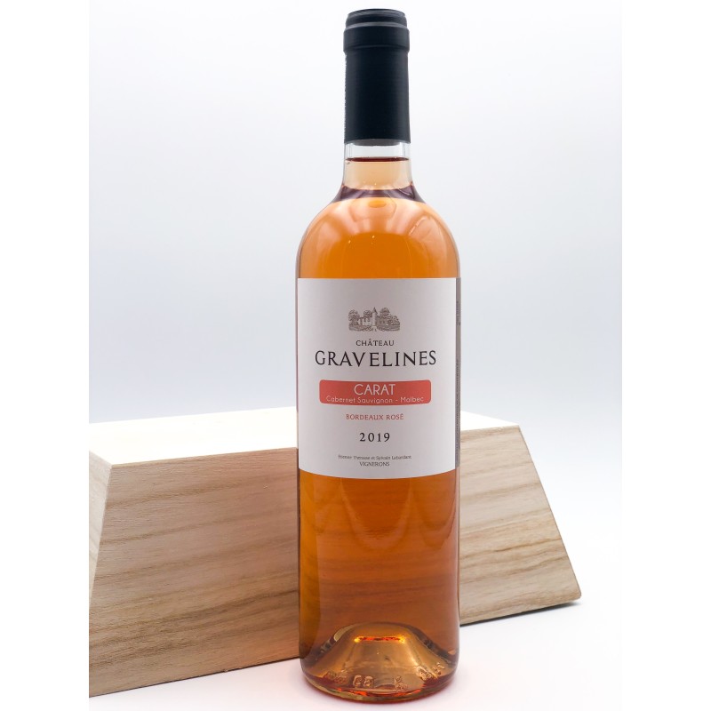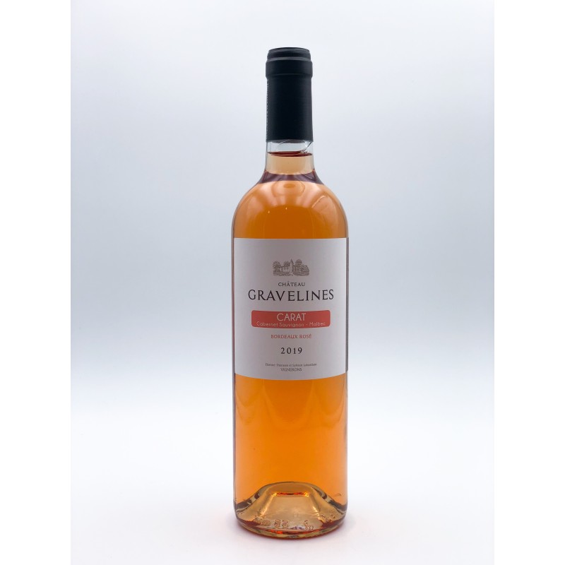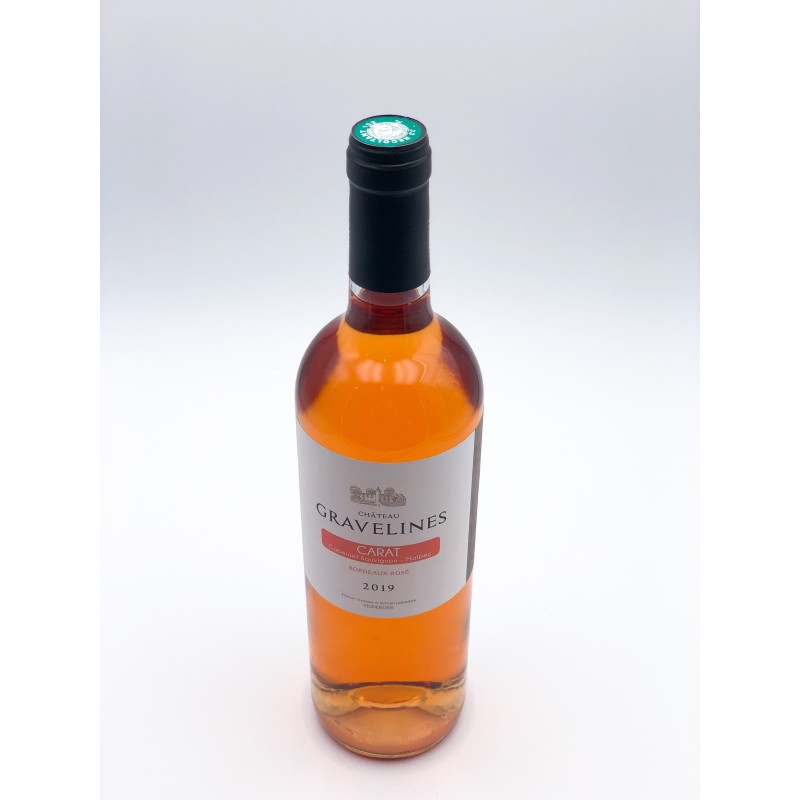 Bouteille de vin de Bordeaux Carat Château Gravelines de 75 cl. Année 2019. 13 %. Ce vin rosé est un rosé d’été et pas que. Bel équilibre entre sucrosité, acidité et gras. Un rosé aromatique de belle structure. Mis en bouteille au château. Contient des sulfites. L'abus d'alcool est dangereux pour la santé, à consommer avec modération.